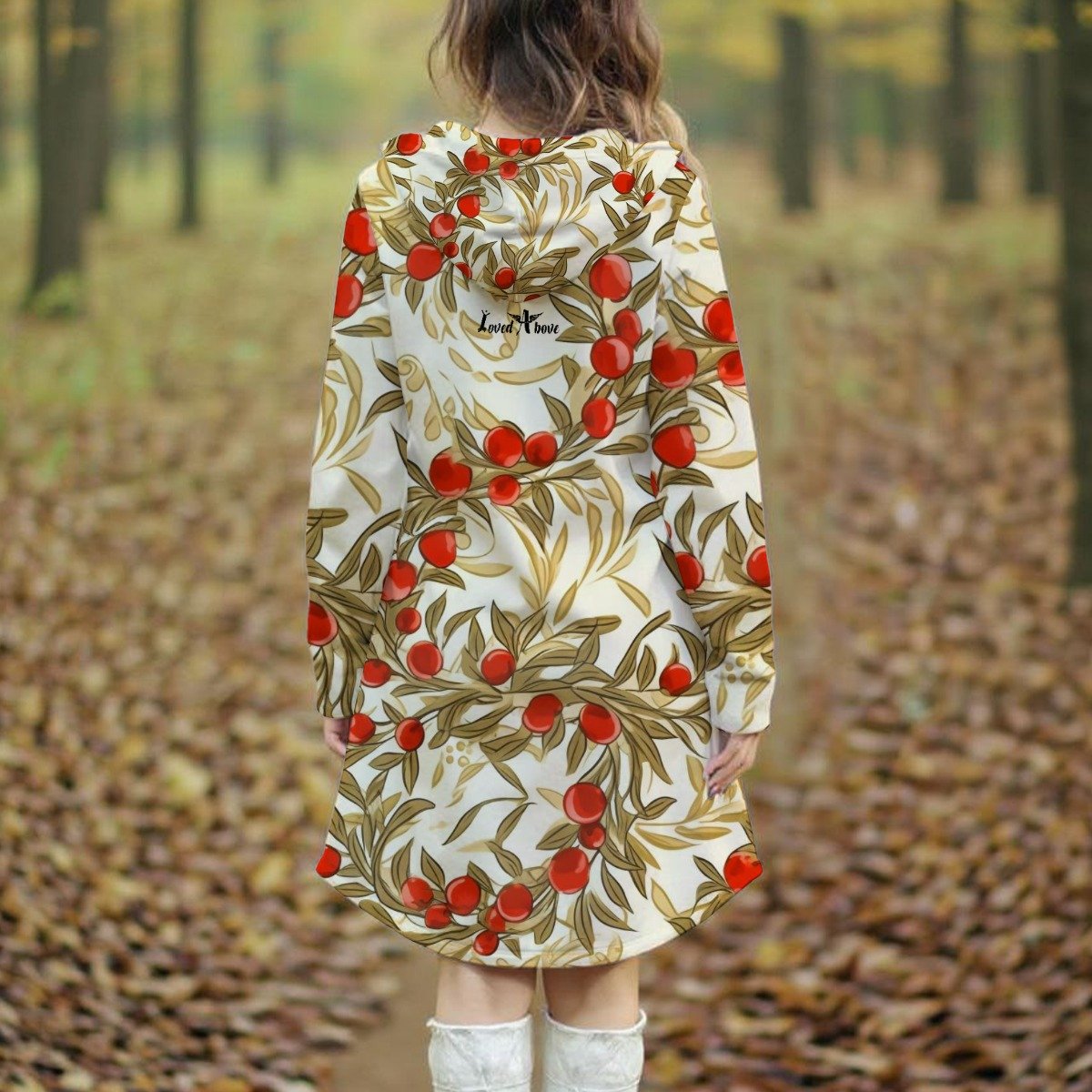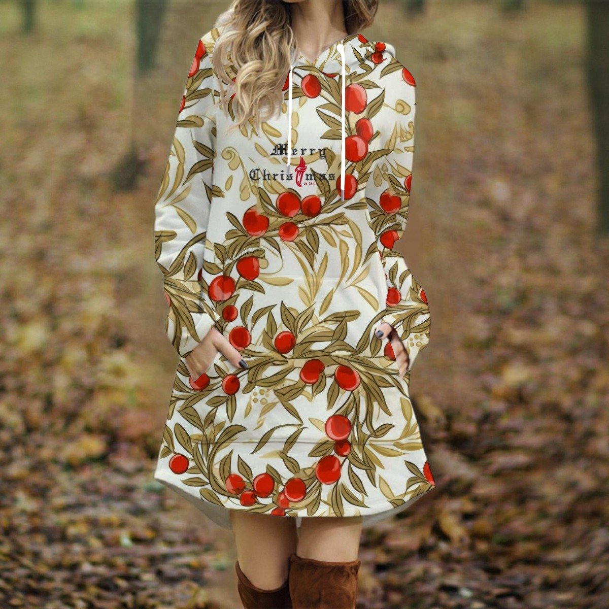 The mid-thigh length, curved hem, and long sleeves create a flattering silhouette, while the drawstring hood and roomy kangaroo pocket bring that effortless street-style flair. Pair it with leggings and boots for an outdoor winter look or wear it solo for a fun and festive vibe.