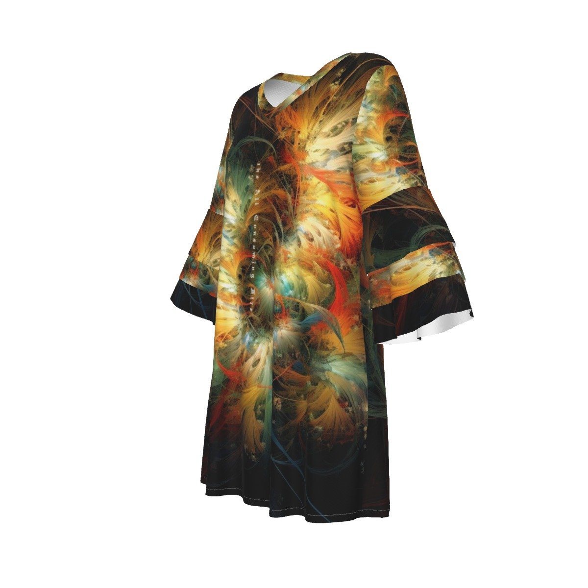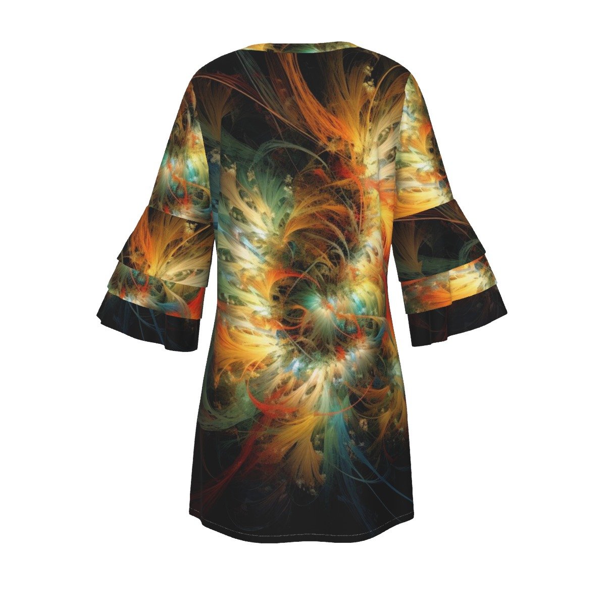 - Features: V-neck dress, raglan sleeves, stacked ruffle sleeves